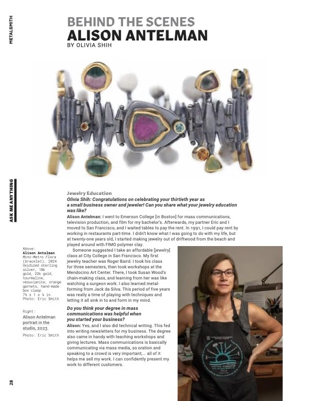 Alison is featured in a four page spread published by SNAG’s Metalsmith magazine, Volume 45, No. 3 2025, Behind the Scenes, is in the current issue. She was interviewed by Assistant Editor, Olivia Shih.